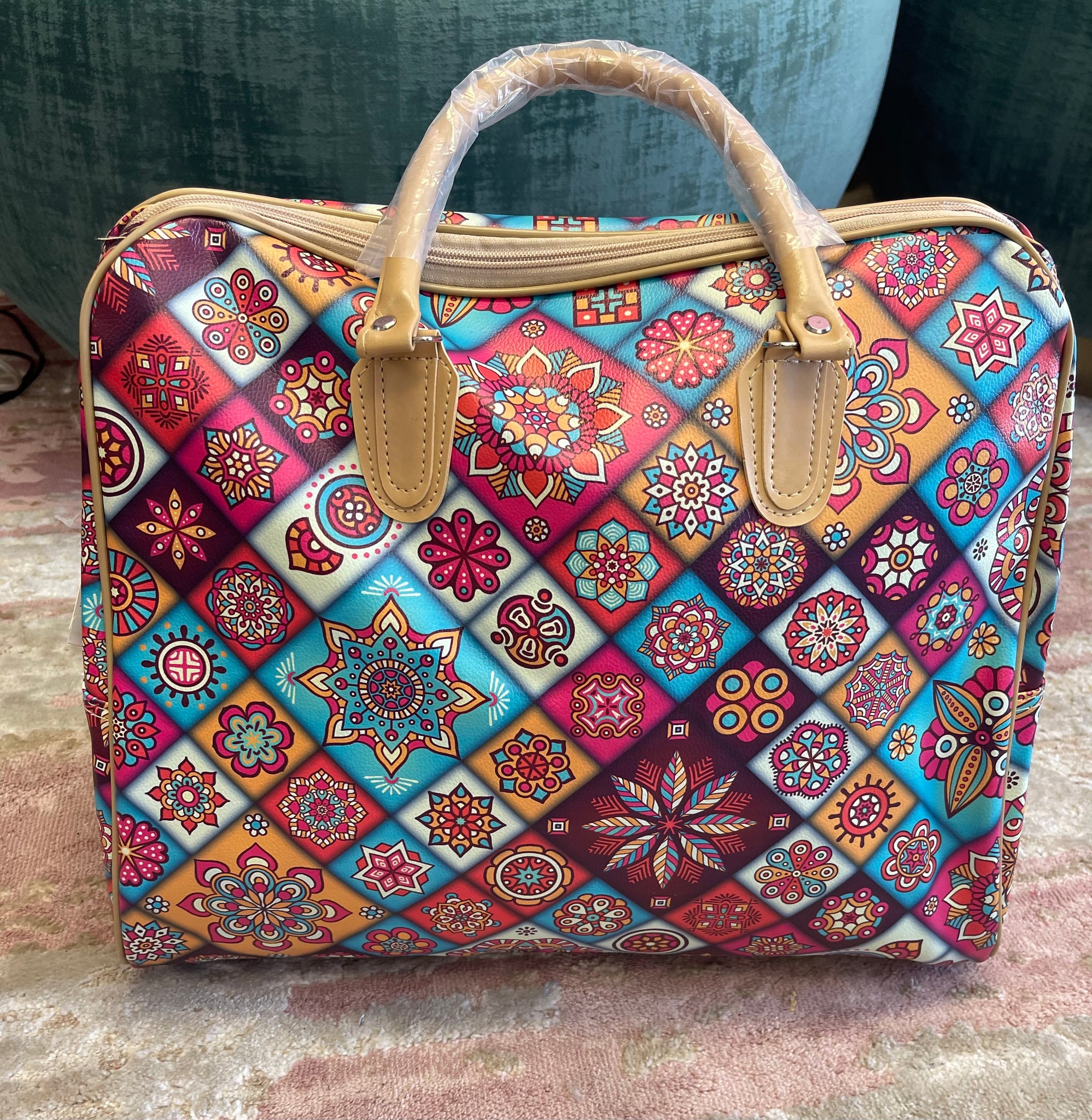 Great for a carry on bag, travel bag or a weekender! Has adjustable detachable straps and round zipper closure.