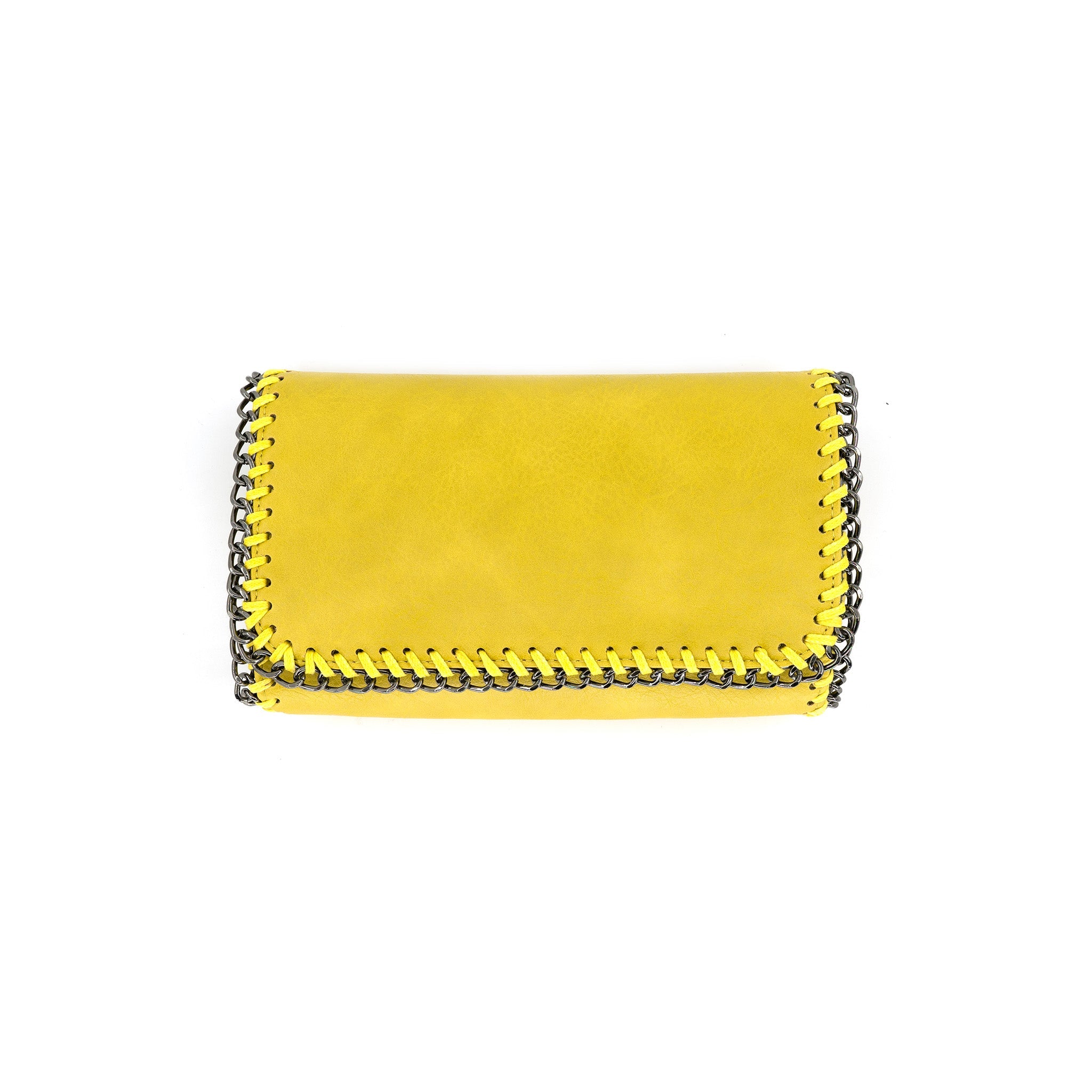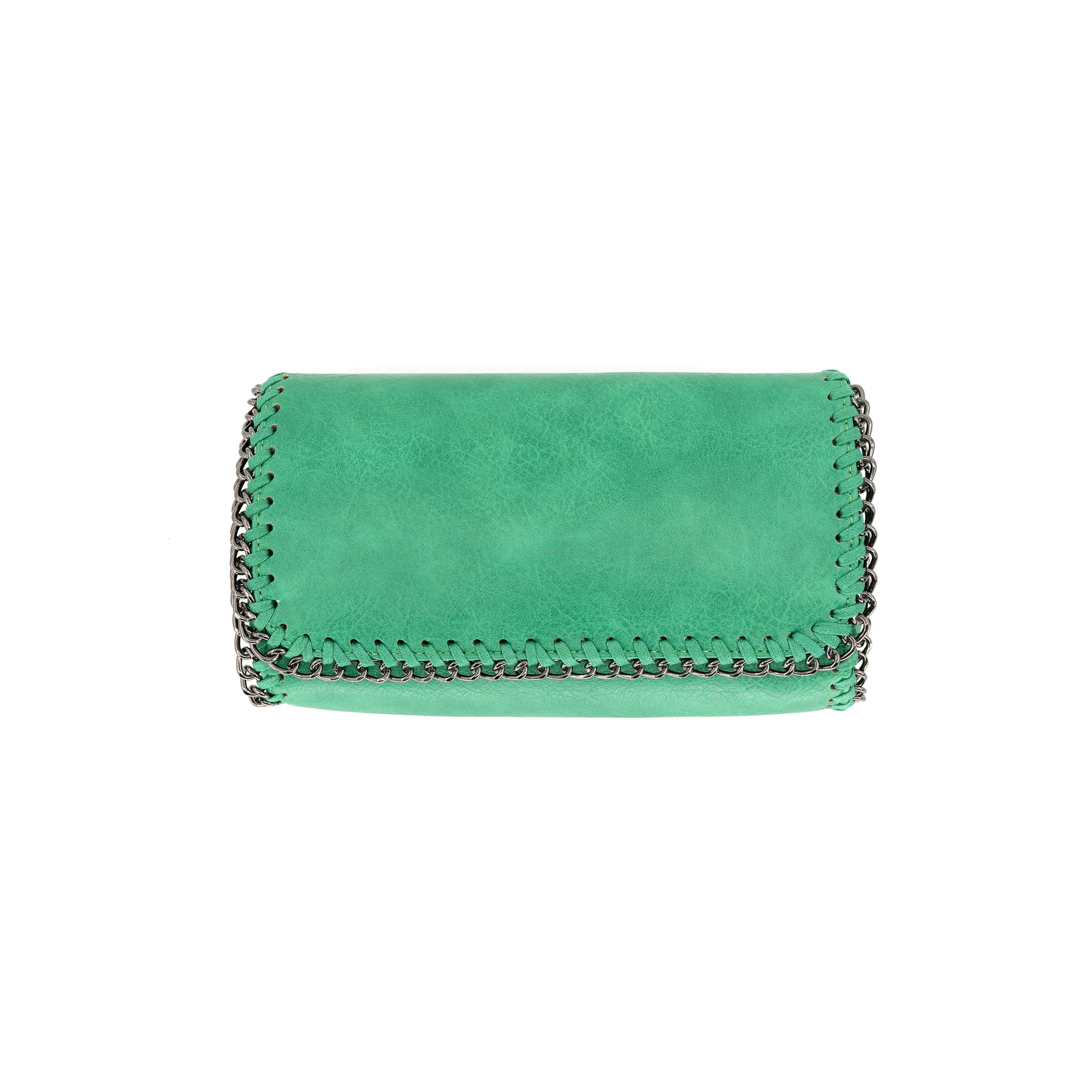 This is a Soft Fold Over Clutch with chain trim and chain strap. The perfect bag with your favorite attire!