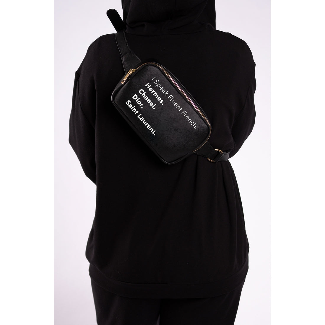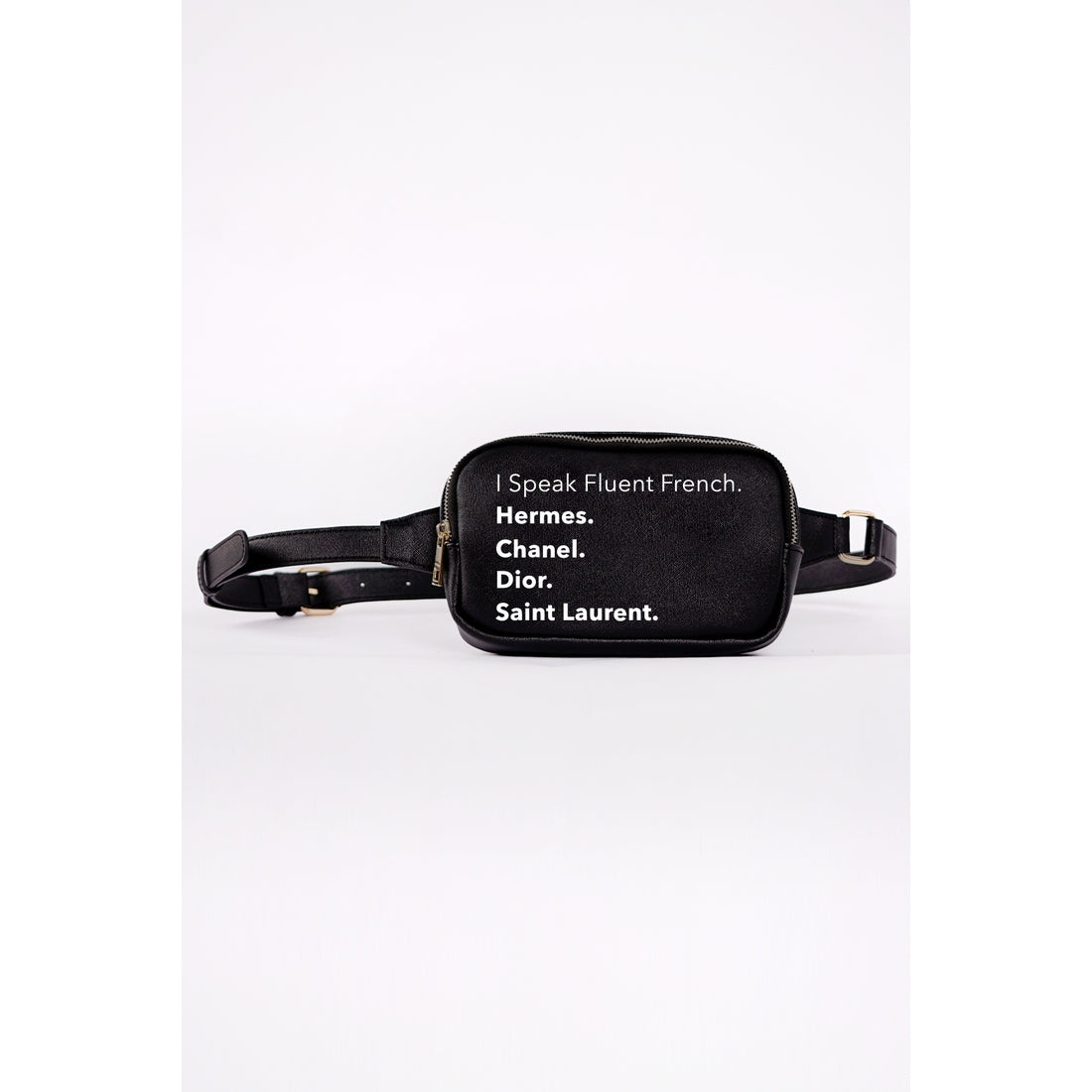 The Franny Fanny Pack is simple in functionality but sophisticated in design with gold metal finishings that provide an elevated look. Gold zipper closure to the main pouch that is lined with a nice durable nylon. The bag fits up to 46” around the waist or across the body. On trend or on the go this bag is made for it all.