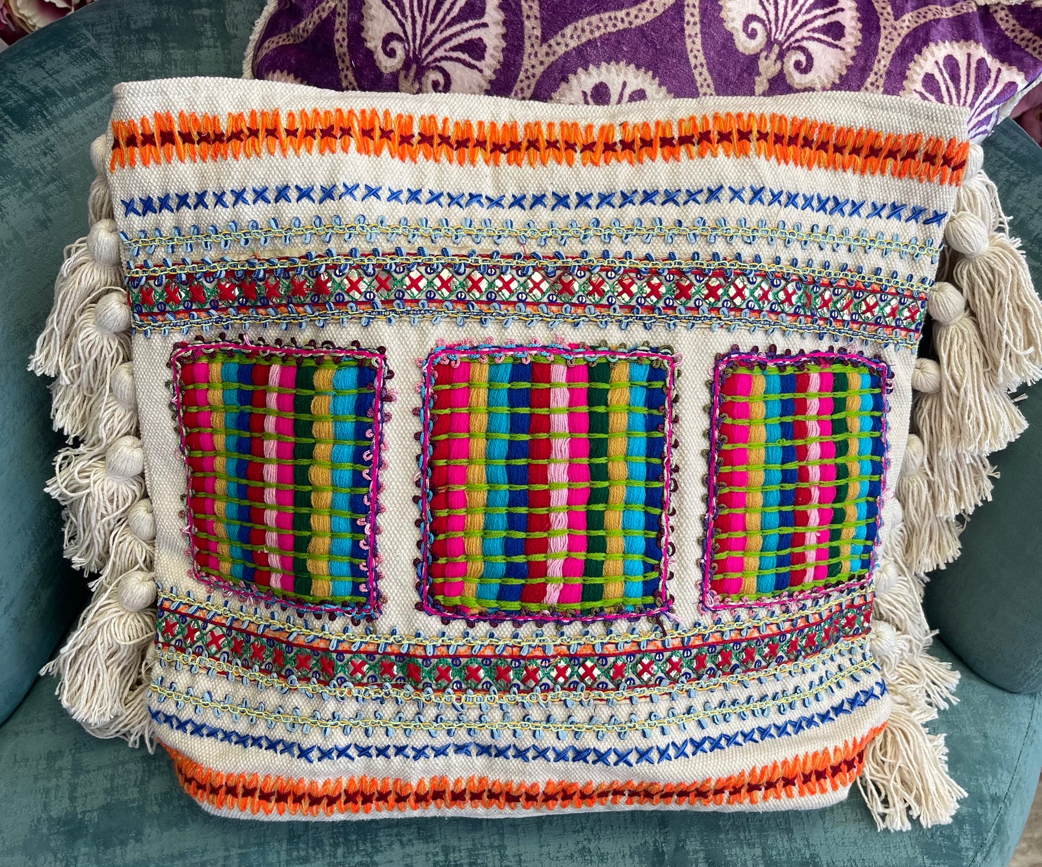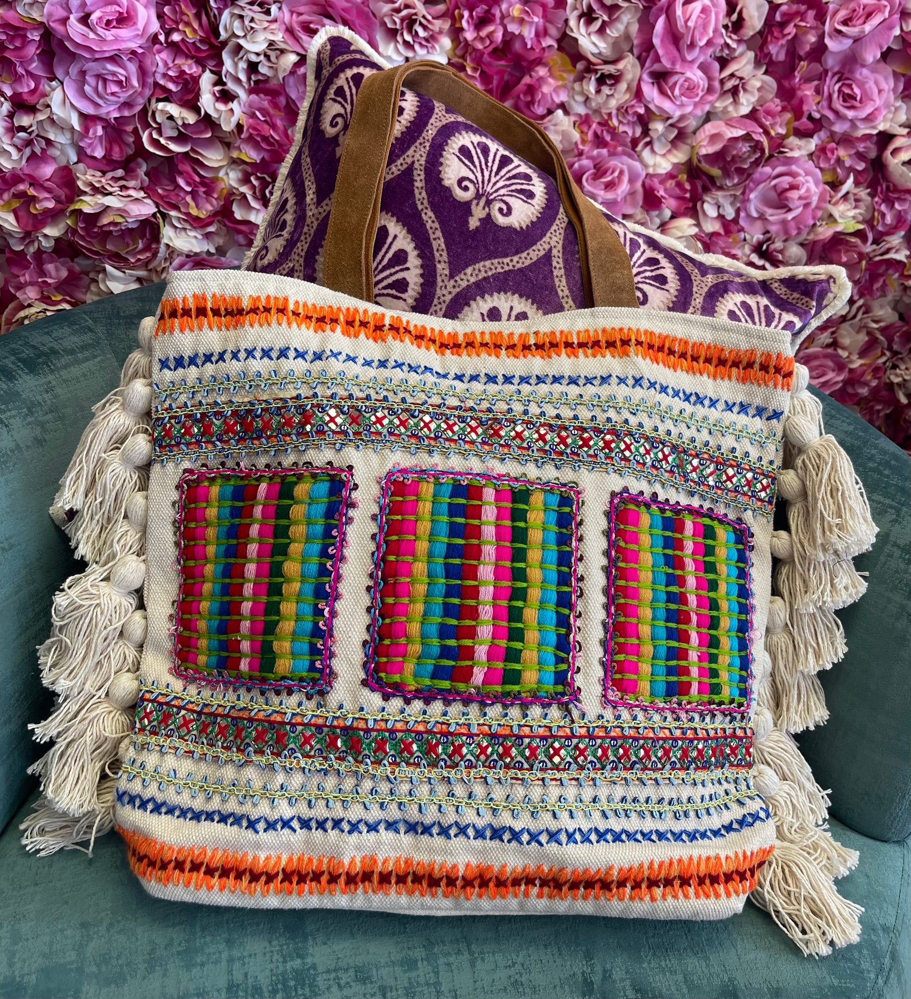 Goldie Mix Canvas Tote with lots of multi colored stitching, embellishments, side fringe and suede straps.