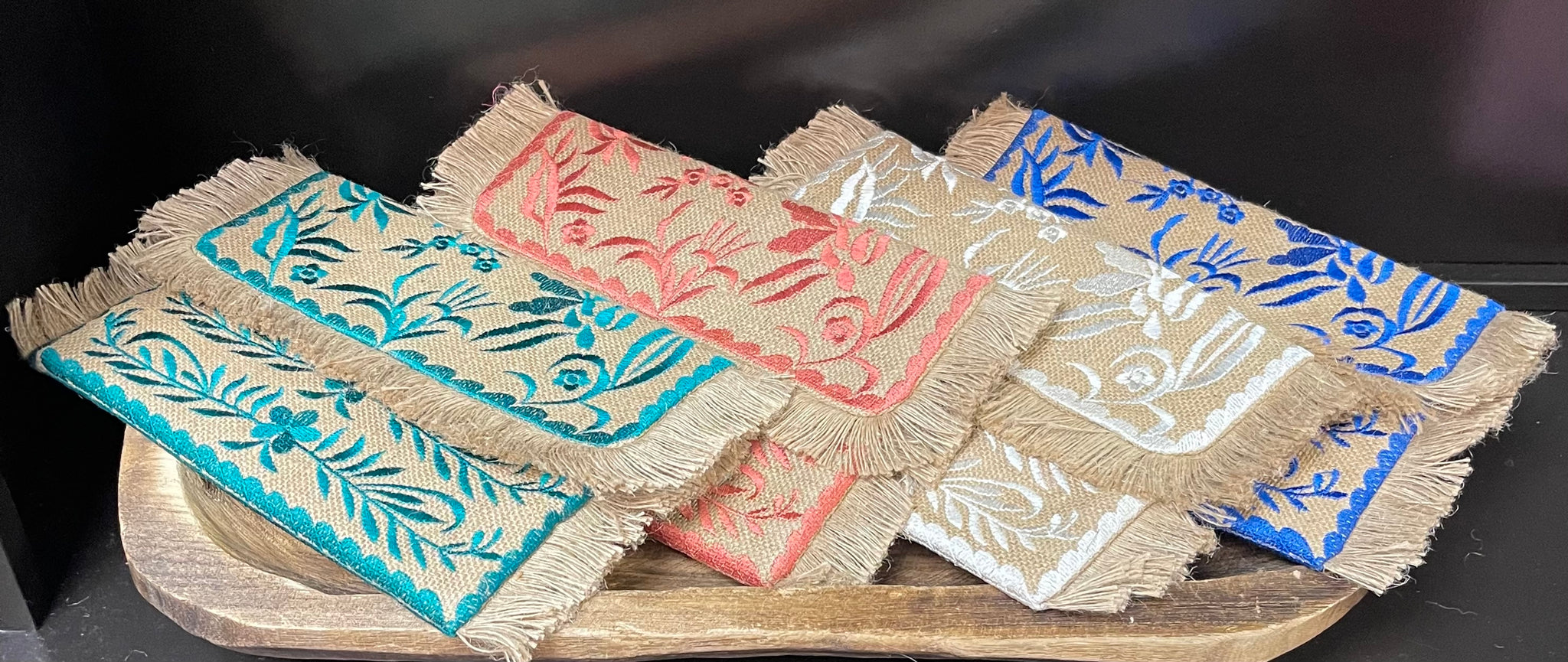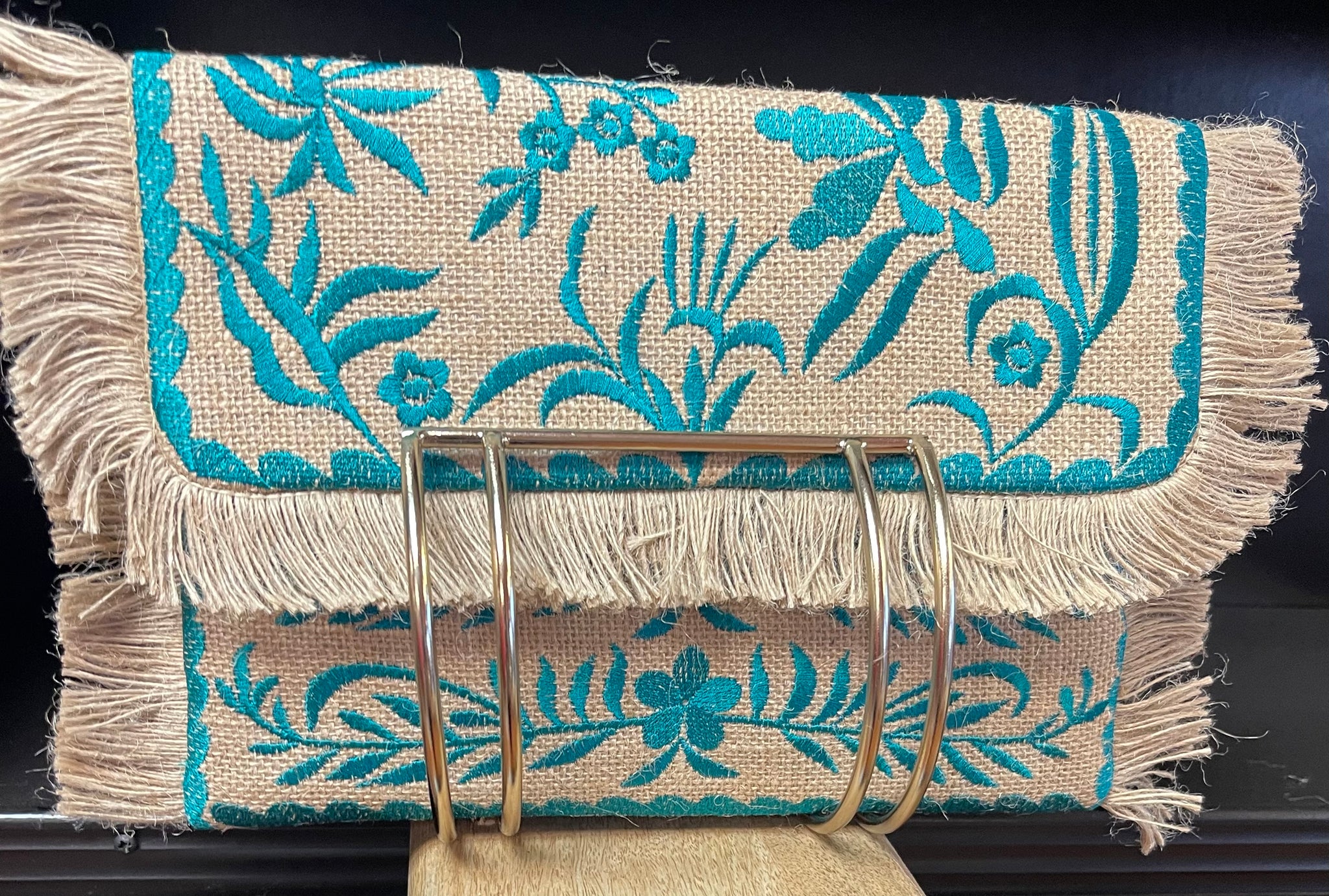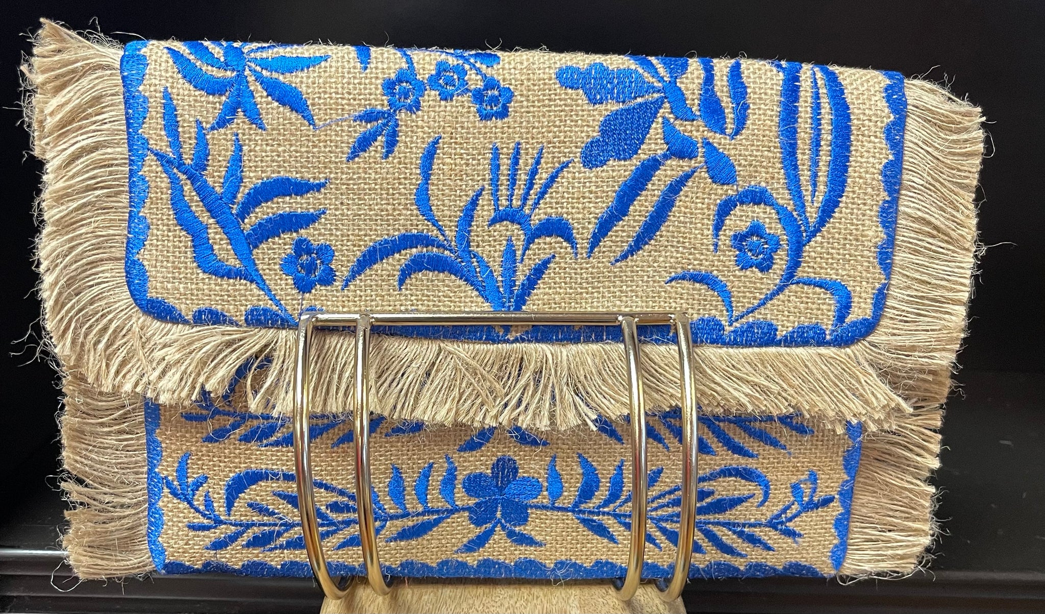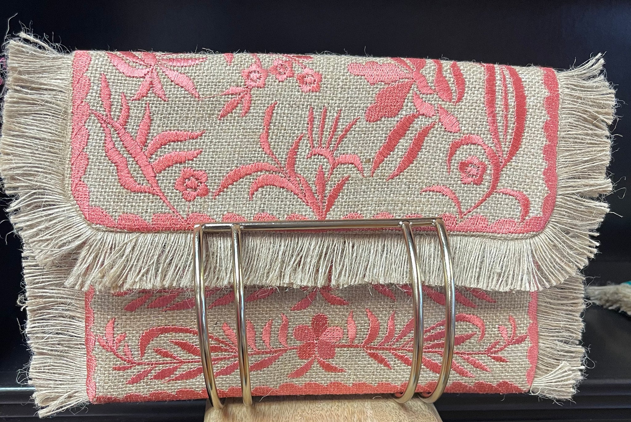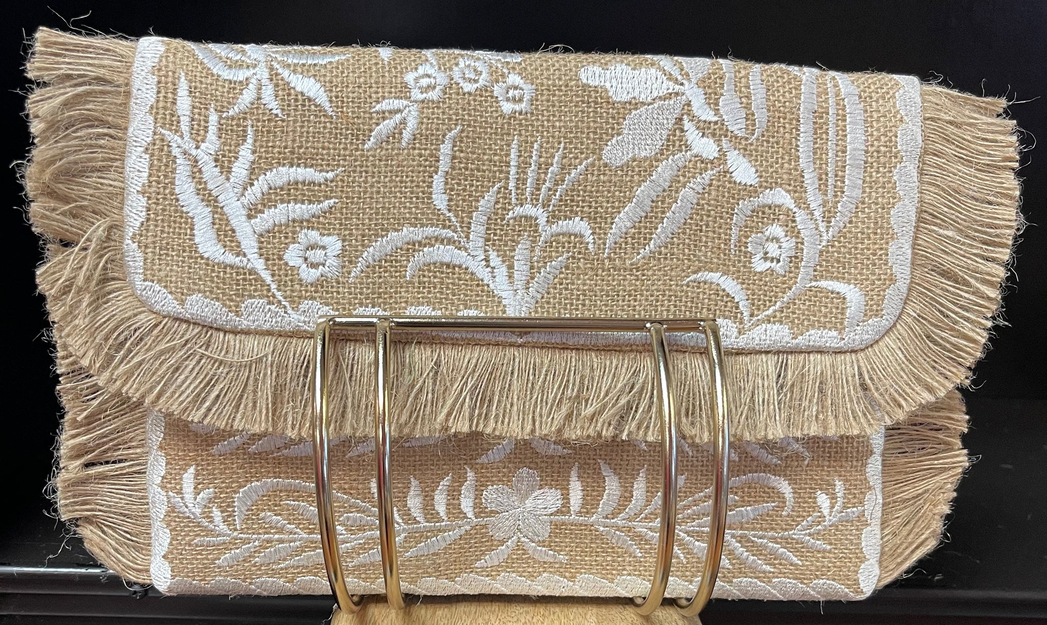 Straw Embroidered Clutch with Fringe and shoulder chain strap.