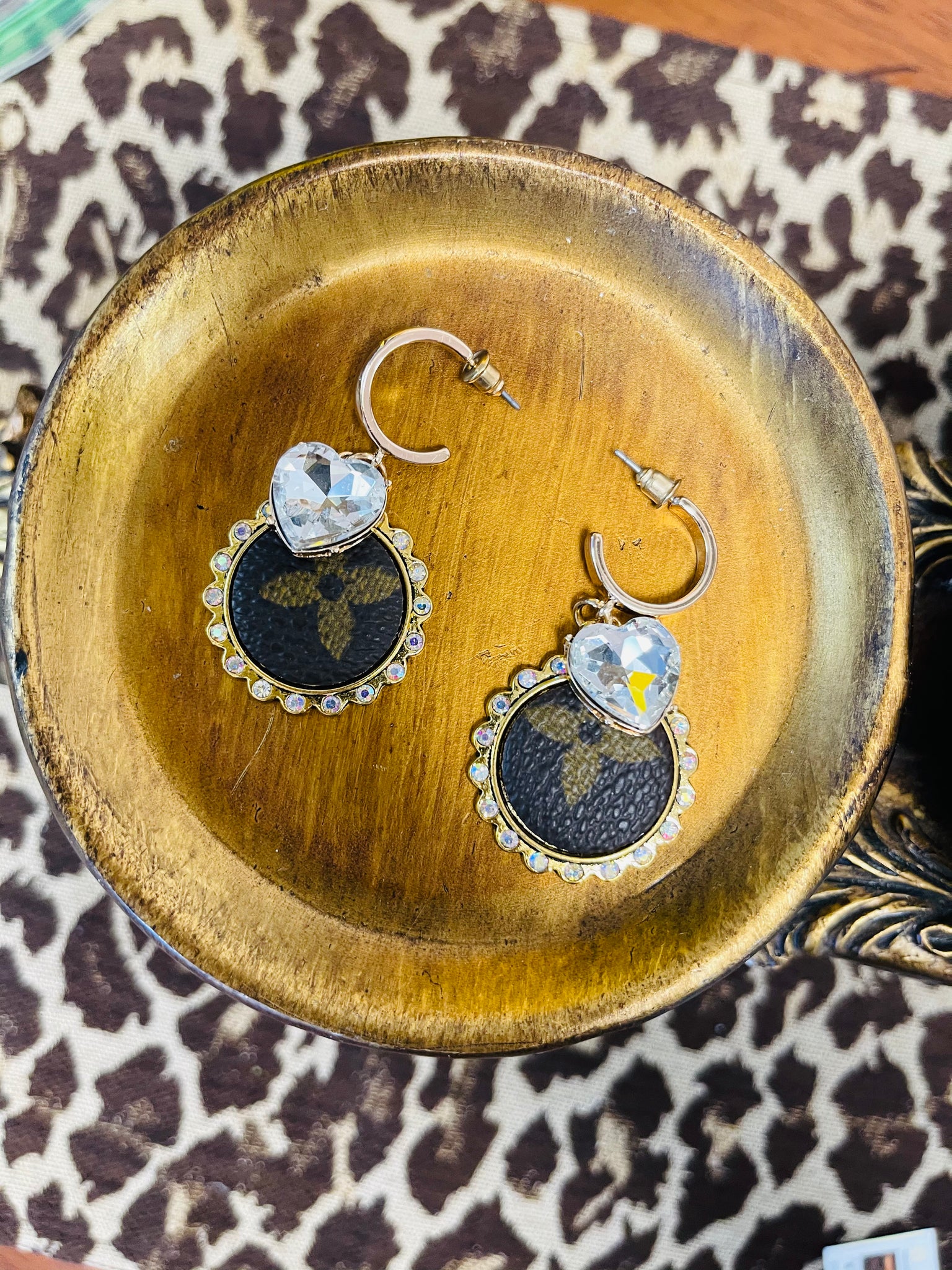 Small Gold Hoops with upcycled charm and crystal