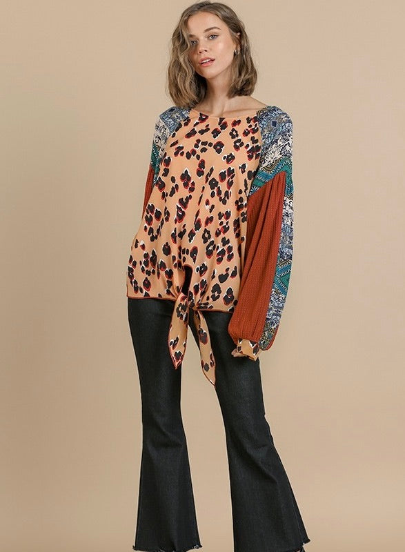 Animal and Scarf Mixed Print Long Waffle Knit Puff Sleeve Round Neck Top