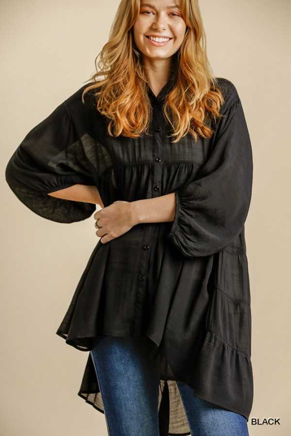 3/4 Sleeve Collar Button Down Back Tiered Tunic Dress with High Low Hem