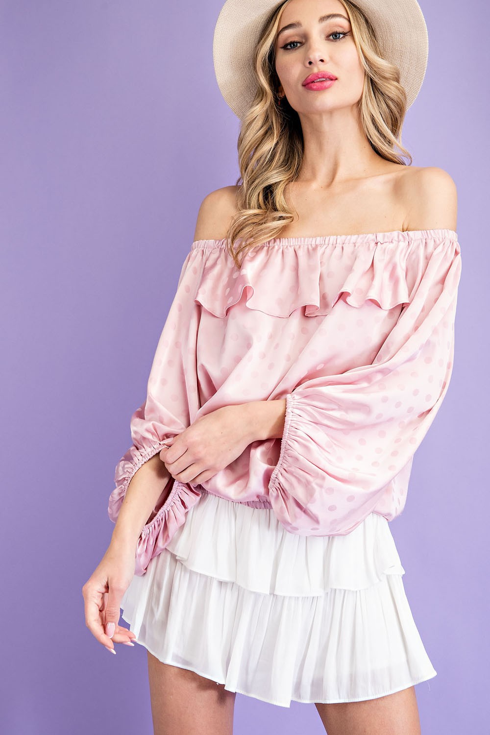 An off the shoulder top with an all around polka dot print, ruffle neckline, and peasant sleeves.