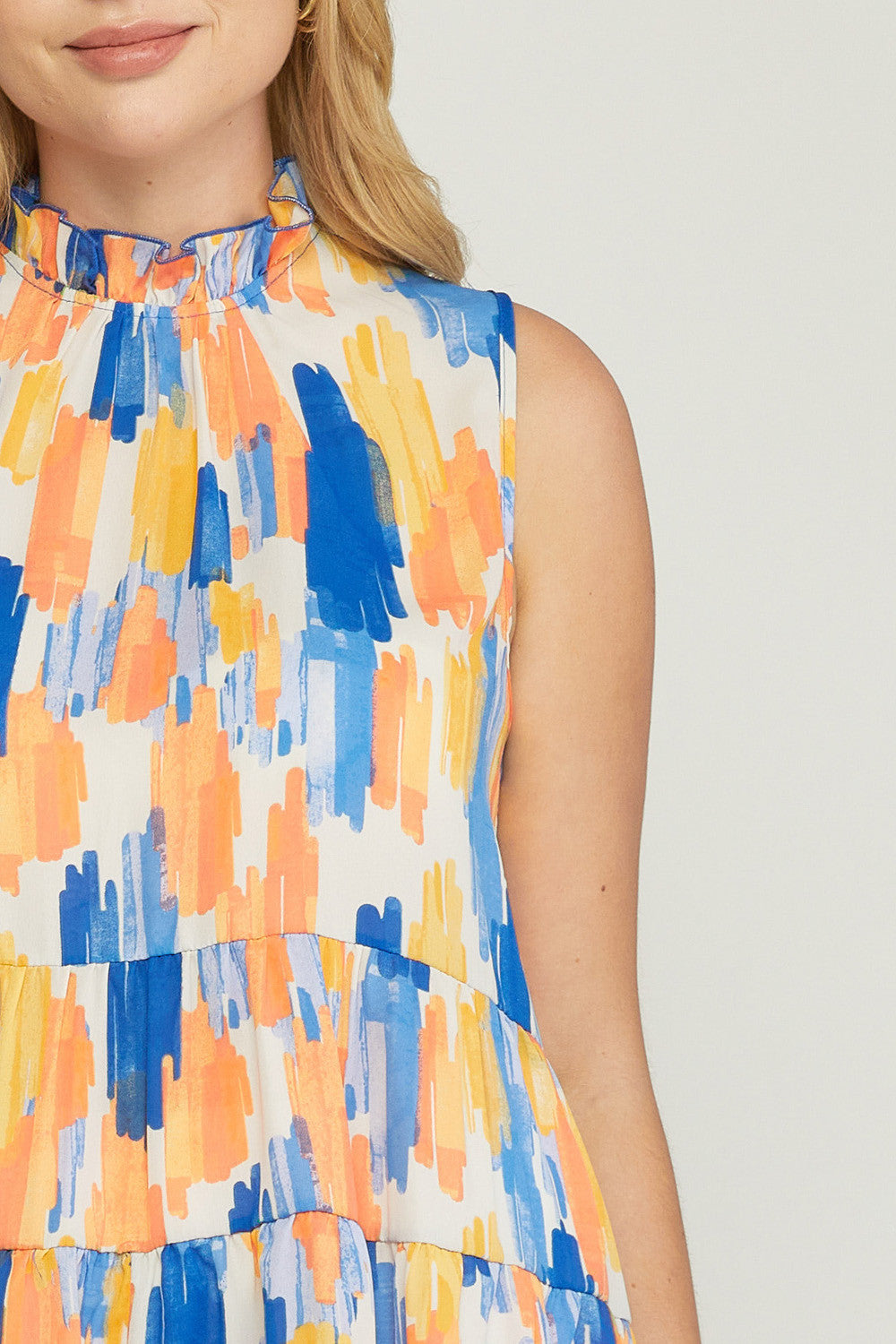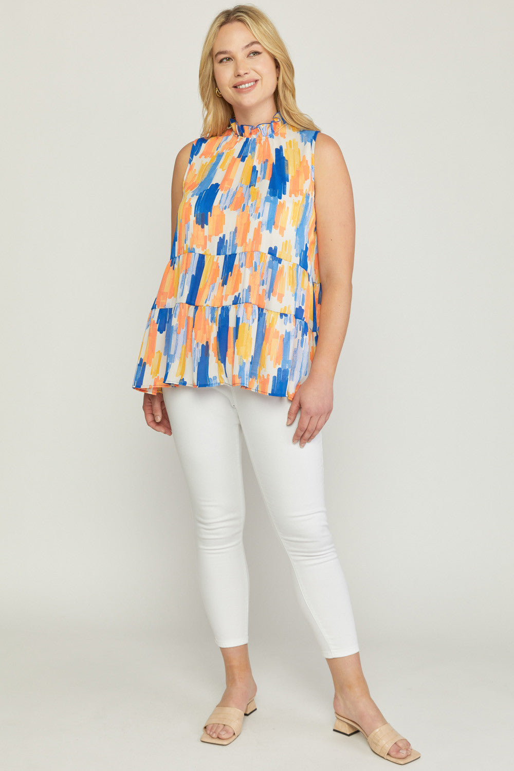 Printed mock neck sleeveless top featuring ruffle detail at neckline. Button closure at back. Unlined. Non-sheer. Woven. Lightweight.