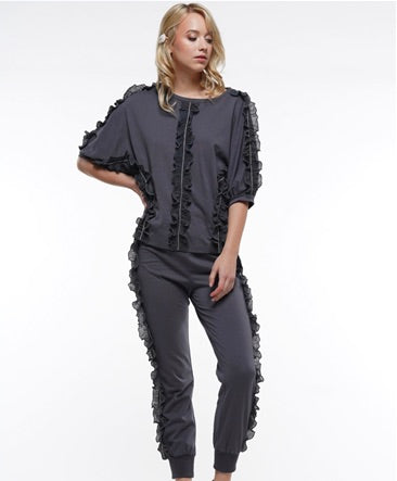 Short Sleeve Pleated Ruffle Trim Knit Top
