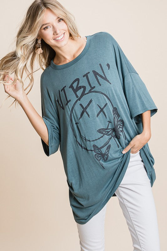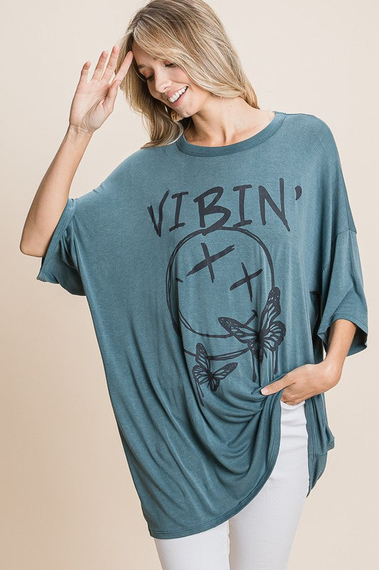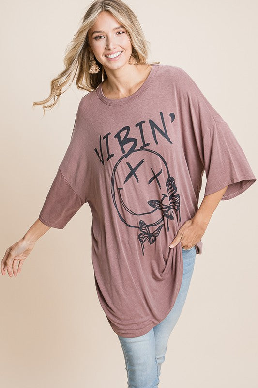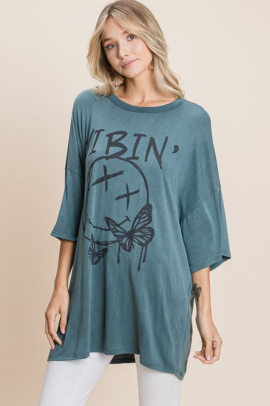 An oversized knit top featuring round neck, short sleeve and graphic print detail.