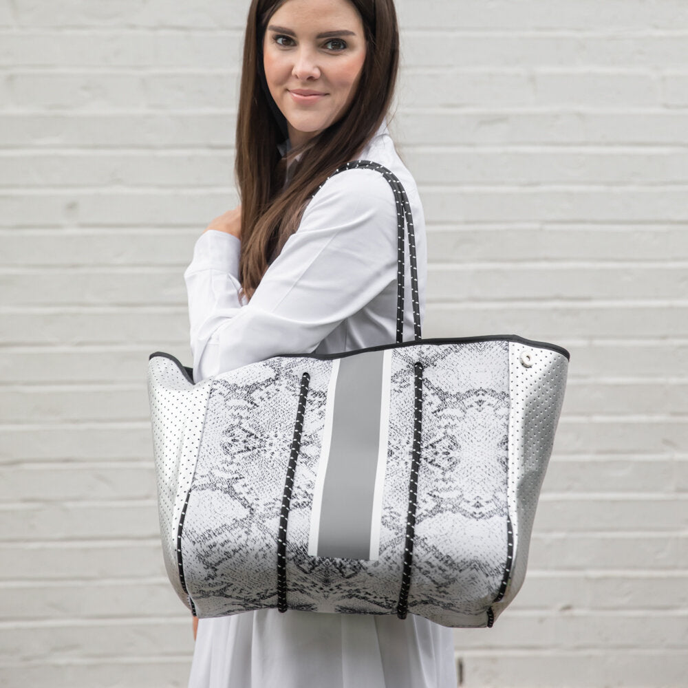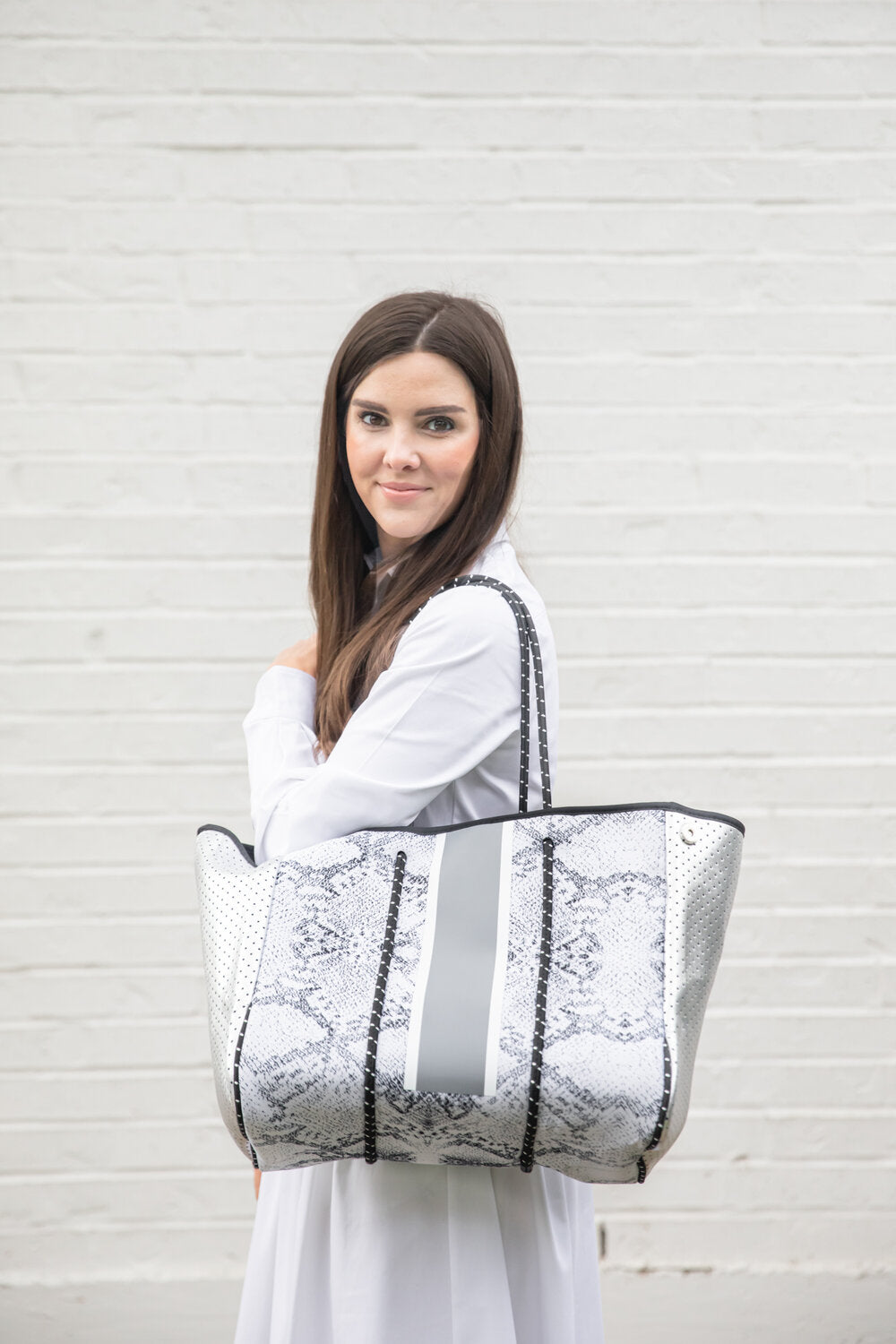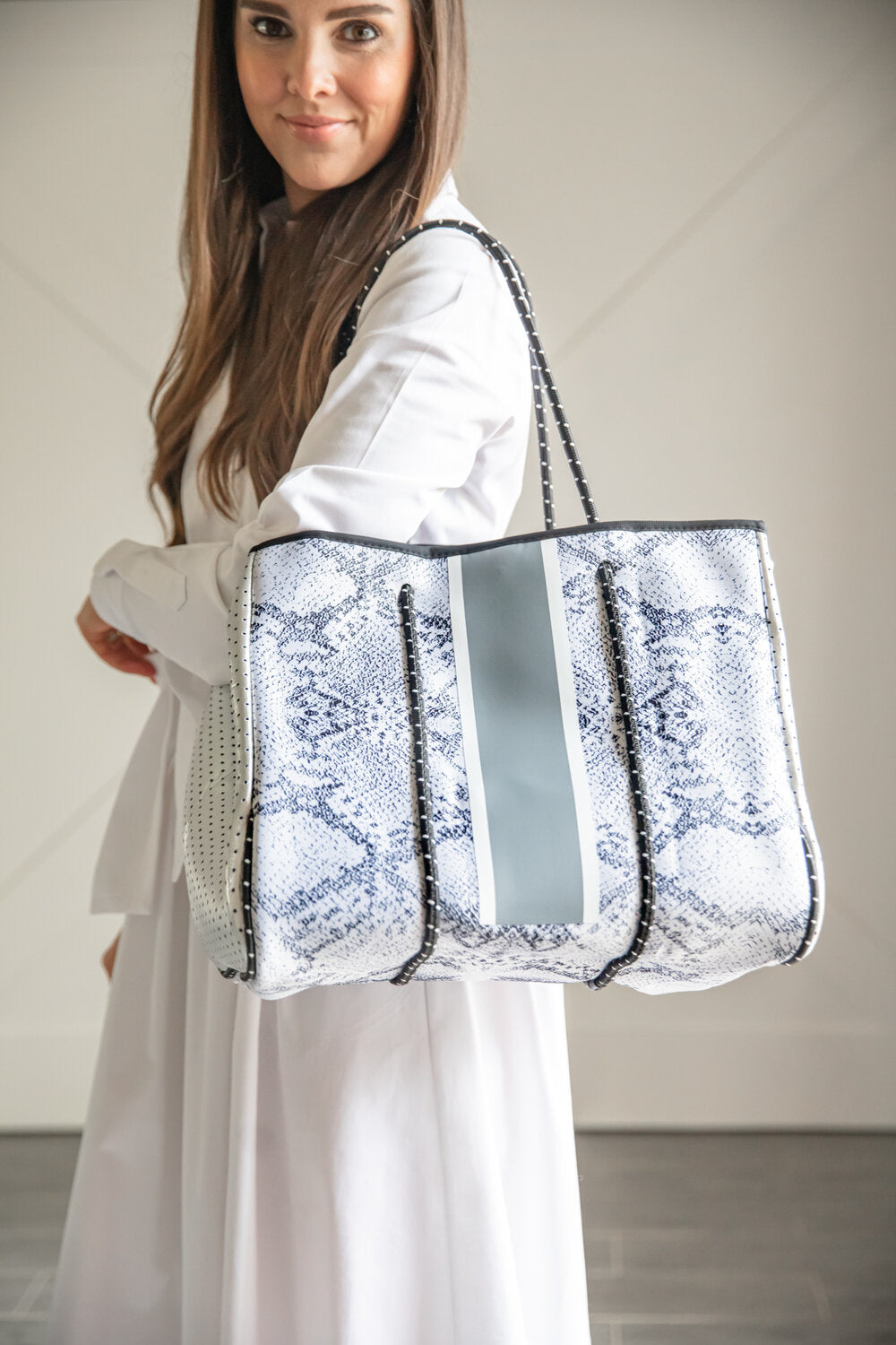 This spacious carry-all tote bag is bound to be your new favorite bag. Made from lightweight yet durable neoprene, this large tote has double rope handles, which have a dash of contrasting color, finished with a removable wristlet pouch and hard bottom liner. This accessory can’t wait to join you on your weekend travels, fun brunch or girls night out!
