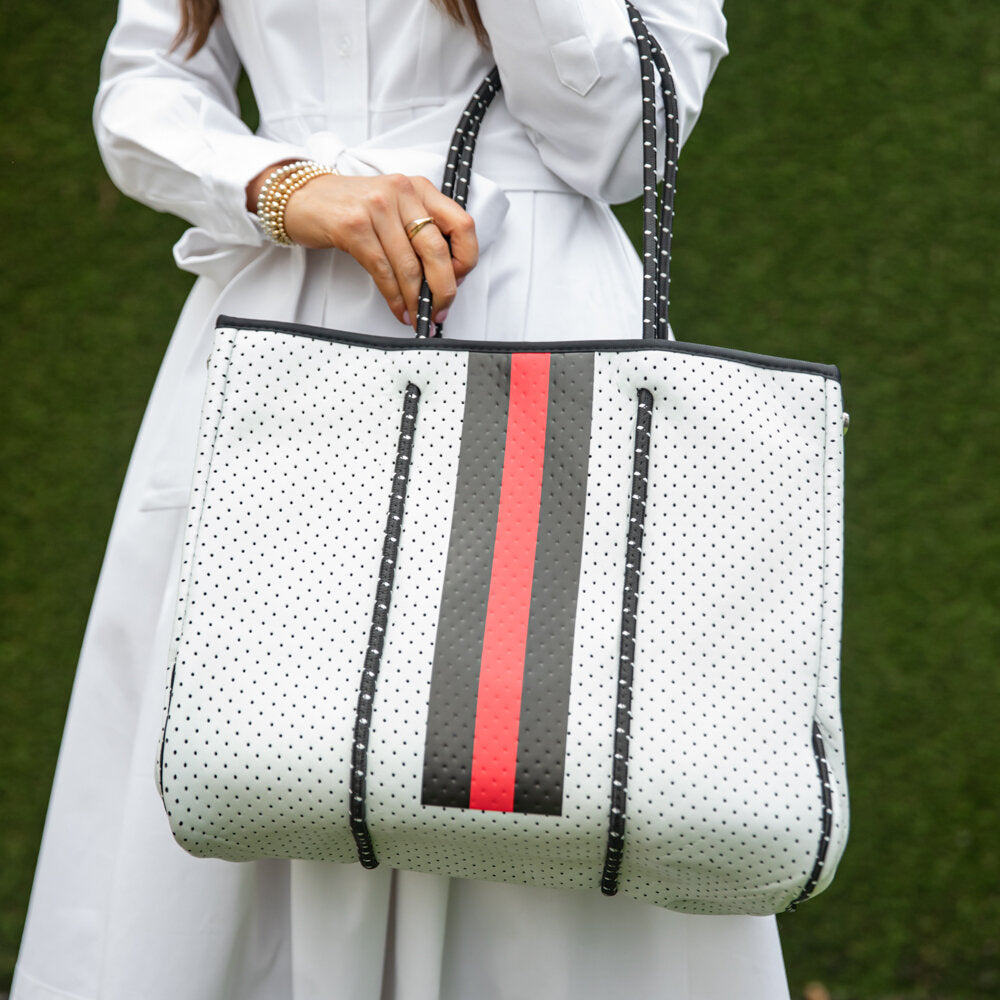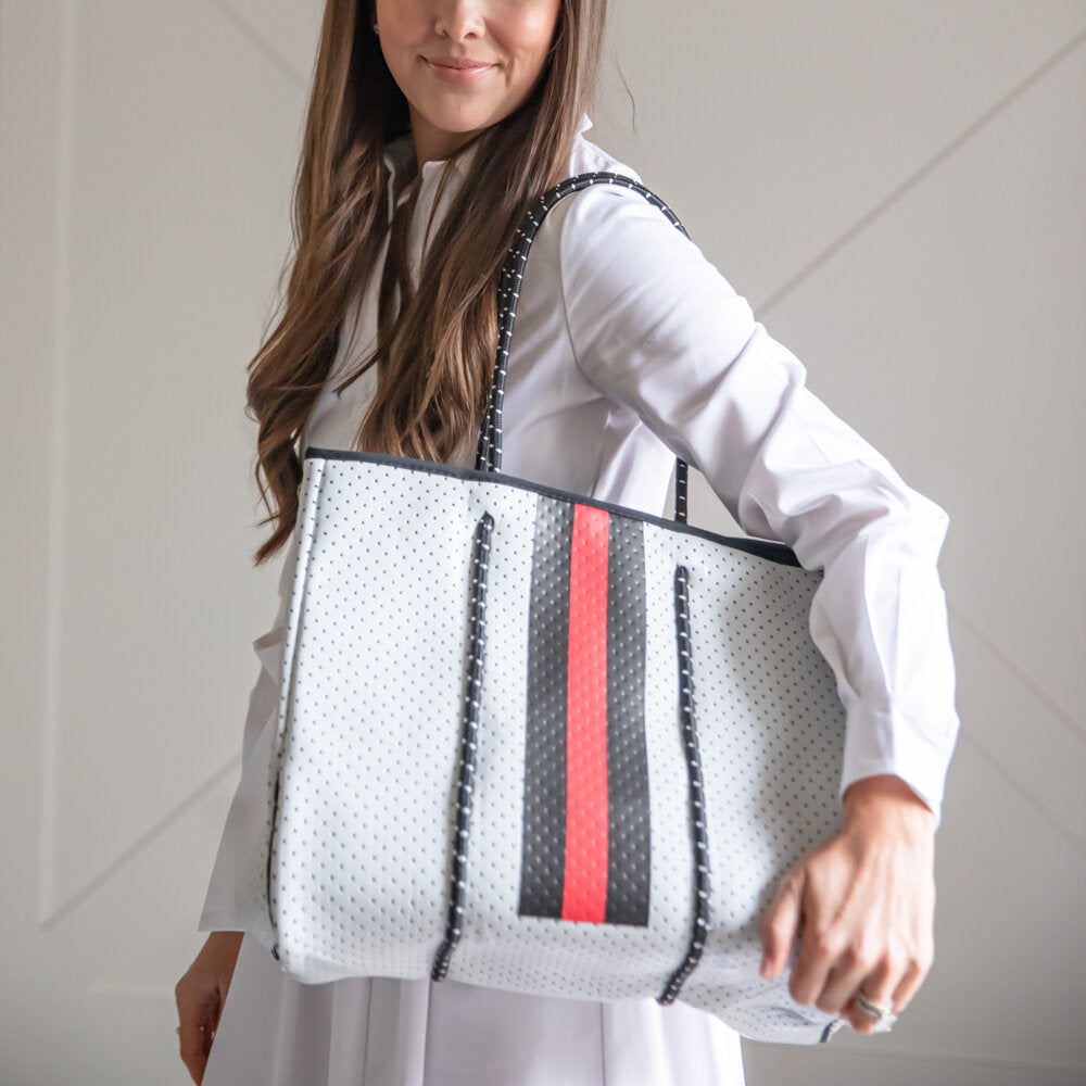 This spacious carry-all tote bag is bound to be your new favorite bag. Made from lightweight yet durable neoprene, this large tote has double rope handles, which have a dash of contrasting color, finished with a removable wristlet pouch and hard bottom liner. This accessory can’t wait to join you on your weekend travels, fun brunch or girls night out!